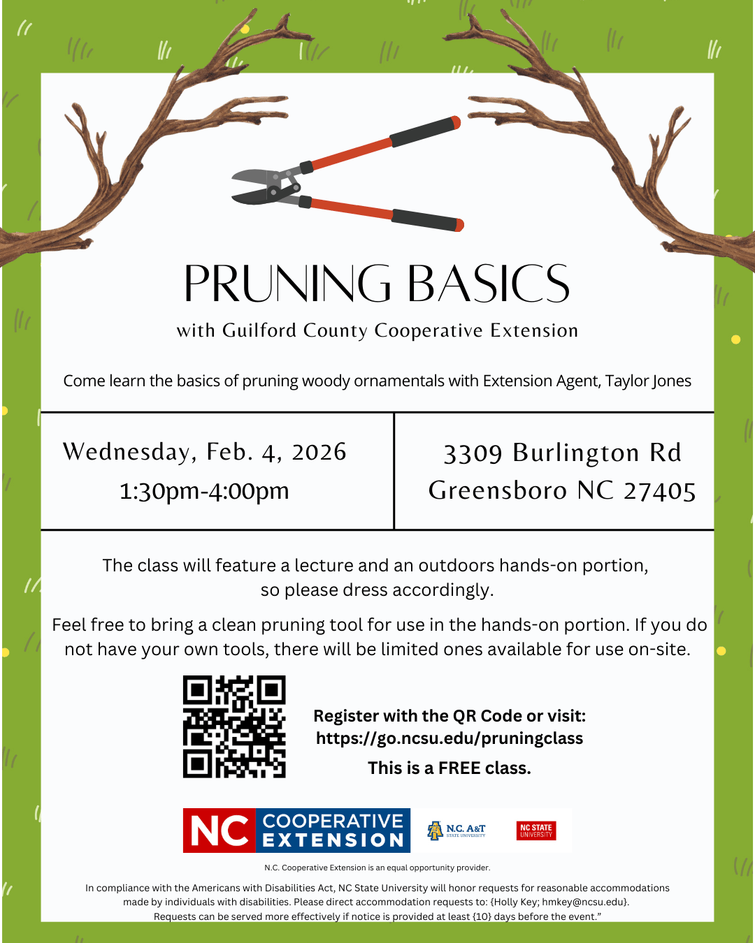 Come learn the basics of pruning woody ornamentals to bring in the new year with Extension Agent, Taylor Jones! There will be a lecture and an outdoor hands-on portion of the class, so please dress comfortably. Feel free to bring your favorite pruning tool for use in the hands-on portion. If you do not have your own tools, there will be limited ones available on-site for use.