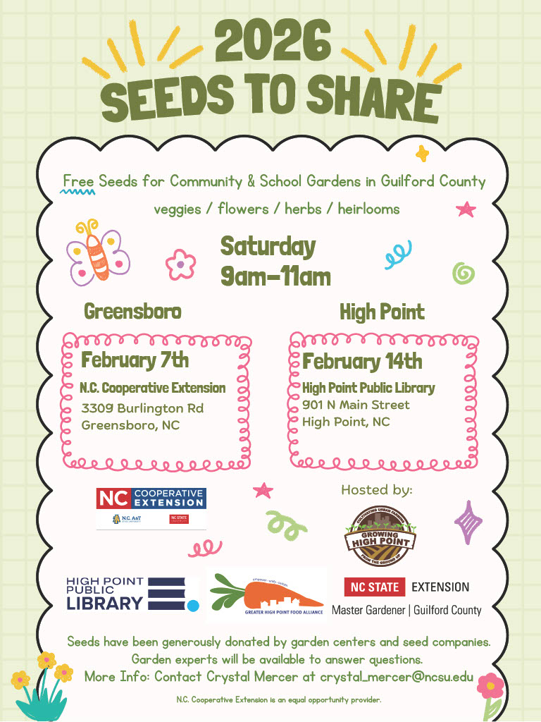 Join us at our Seeds to Share 2026 events in February to access free seeds reserved just for community & school gardens in Guilford County! Seeds for vegetables, flowers, herbs, and even heirlooms will be available! Our February 7th date will be at the N.C. Cooperative Extension, Guilford County Center in Greensboro. Our February 14th date will be at the High Point Public Library, hosted by Growing High Point. Questions? Contact Crystal Mercer, Community and School Gardens Agent, (336) 641-2427 or crystal_mercer@ncsu.edu