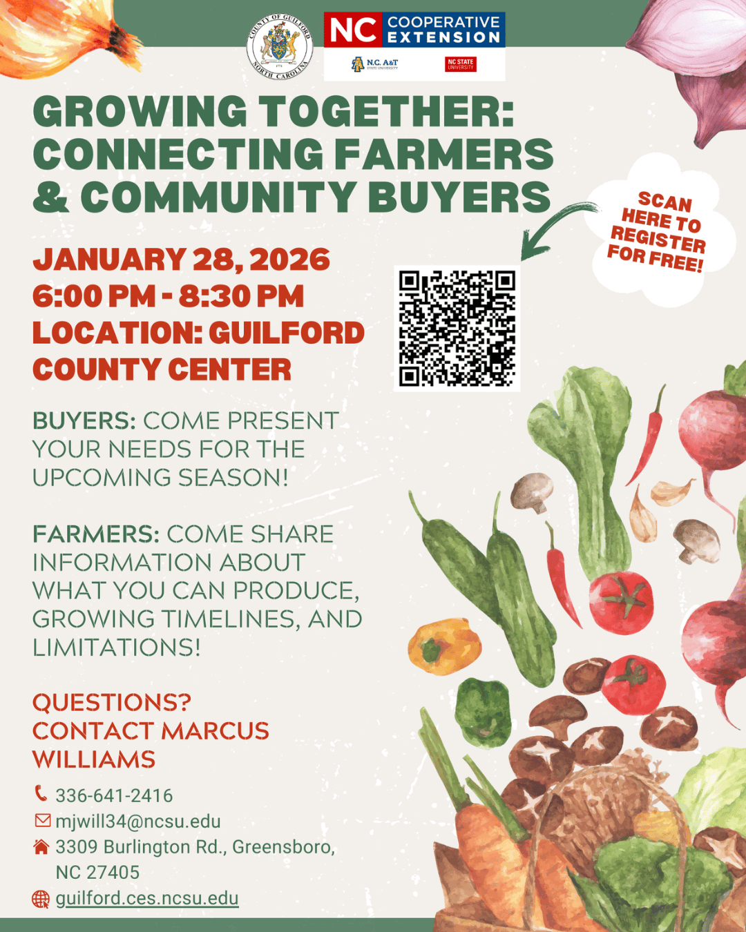 Join us for our second "speed dating" event between buyers and farmers, in which we are linking local farms, local plates, and local institutions! This event is a dynamic, relationship-focused meet-up designed to strengthen the local food supply chain by bringing Guilford County farmers and food buyers together in one room. This event will take place at the Guilford County Center (3309 Burlington Rd., Greensboro, NC 27405) on January 28, 2026, from 6:00 PM - 8:30 PM.