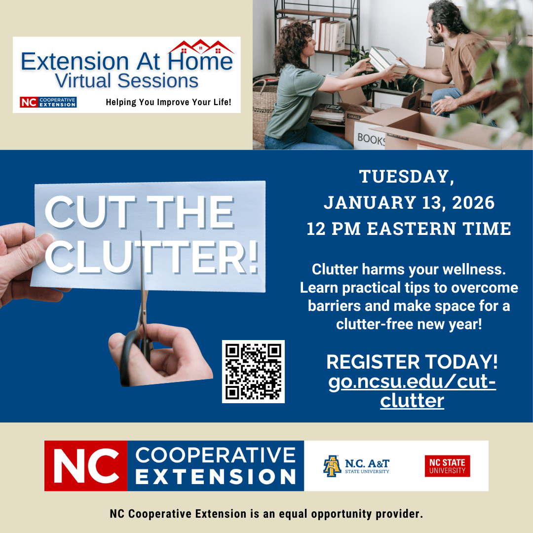 Ready to reclaim your space and reset for the New Year? Join N.C. Cooperative Extension for our highly anticipated "Extension at Home" Virtual Series this month! This session will give you the tools to finally tackle that mess: