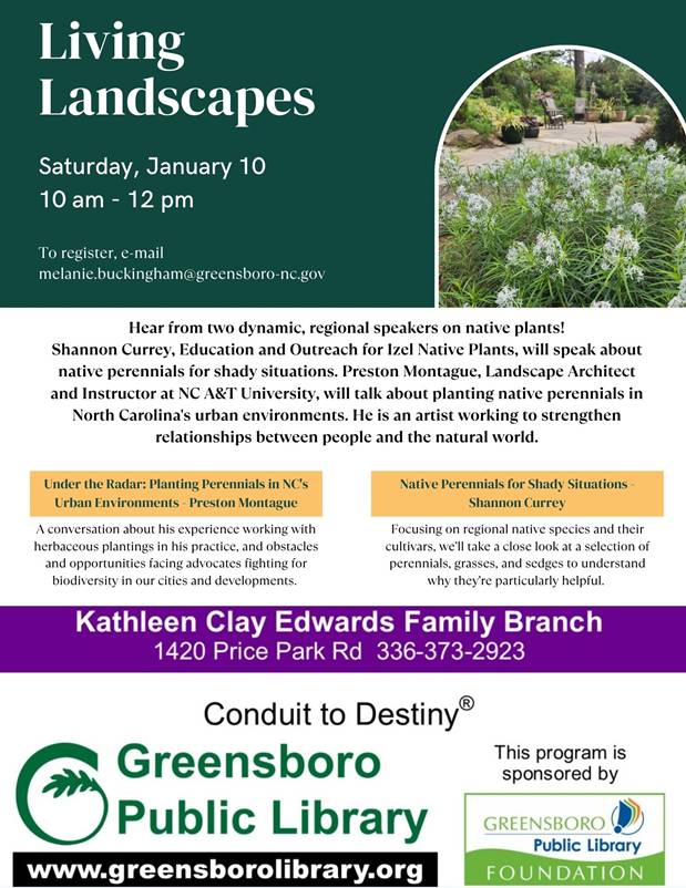 Hear from two dynamic, regional speakers on native plants! Shannon Currey, Education and Outreach for Izel Native Plants, will speak about native perennials for shady situations. Preston Montague, Landscape Architect and Instructor at NC A&T University will talk about planting native perennials in North Carolina's urban environments. He is an artist working to strengthen relationships between people and the natural. Please email Melanie Buckingham to register.