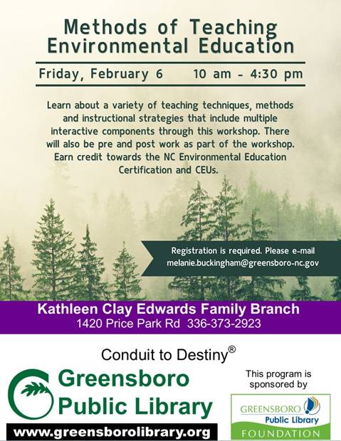 Learn about a variety of teaching techniques, methods and instructional strategies that include multiple interactive components through this workshop. There will also be pre and post work as part of the workshop. Earn credit towards the NC Environmental Education Certification and CEUs. Registration is required. Please email Melanie Buckingham to register!