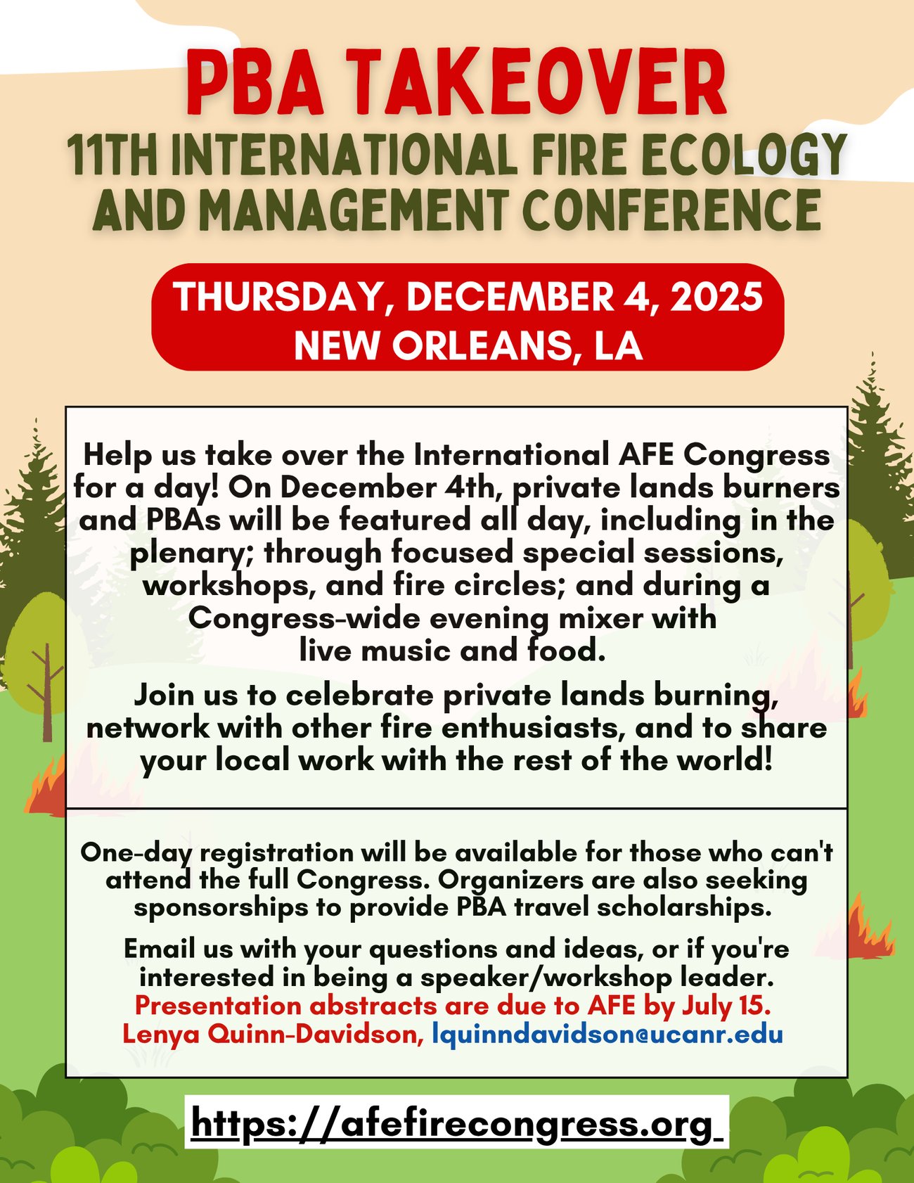 Private lands burners and Prescribed Burn Associations (PBAs) will take center stage at the International AFE Congress on December 4, with a full day of sessions, workshops, fire circles, and a lively evening mixer. It's a chance to celebrate private lands fire, connect with others in the fire community, and share your local efforts with a global audience. One-day registration and travel scholarships for PBAs will also be available! Email Jenn Fawcett (jennifer_fawcett@ncsu.edu) by August 8th if you would like to present at the takeover!