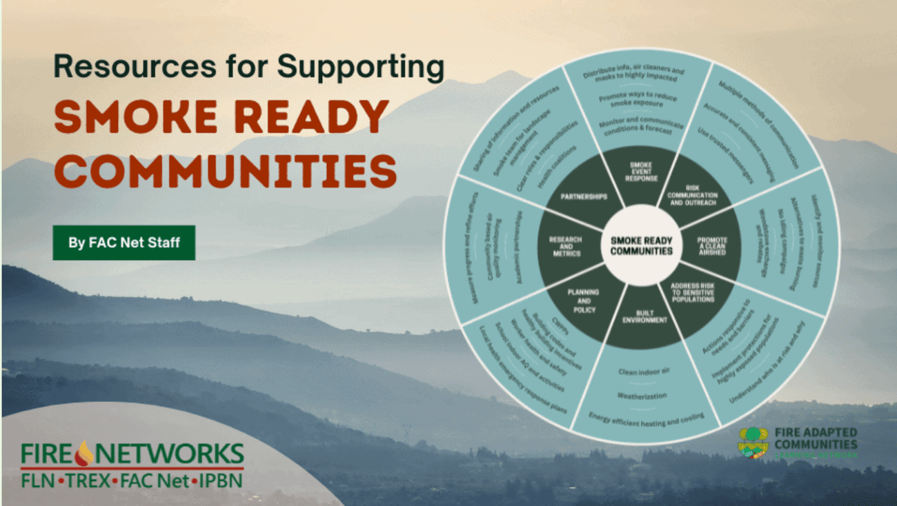The Fire Adapted Communities Learning Network has released new Smoke Ready Communities graphics and companion materials to help communities understand the core elements and partners essential for smoke preparedness. Built off practitioner feedback and modeled on the Fire Adapted Communities framework, these tools include a “who to engage” guide and real-world case