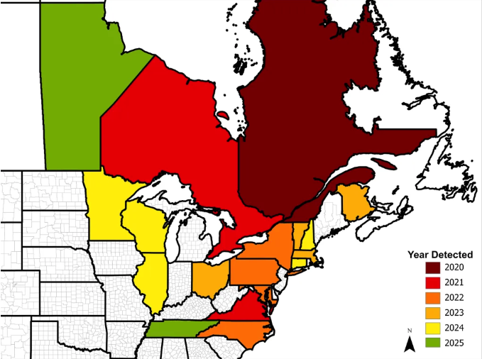 Researchers have found that the elm zigzag sawfly is moving across North America faster than expected, with detections in 14 U.S. states and four Canadian provinces since 2020. It is suggested that long-distance hitchhiking via cacoons attached to vehicles and wood products, and that the populations are entirely female and reproduce without mating, are the cause for their rapid spread. Additionally, we now know they will feed on Japanese zelkova trees, a popular urban planting, after previously thinking elms were their only host.