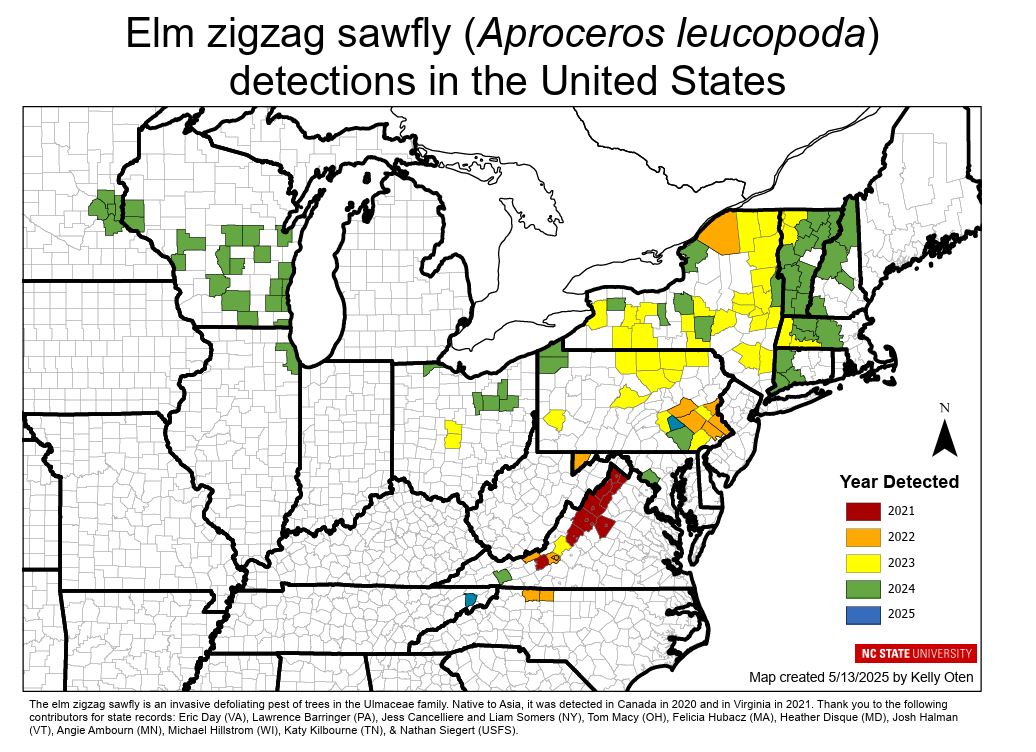The elm zigzag sawfly (EZS) has spread to Tennessee for the first time! Currently, in North Carolina, only two counties have detected EZS (Surry & Stokes counties), both with detection confirmed in 2022. These invasive pests are out and about in warm weather, so keep your eyes peeled. If you see them, report them!