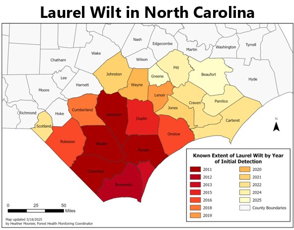Please keep an eye out and report potential laurel wilt in new counties to the N.C. Forest Service!
